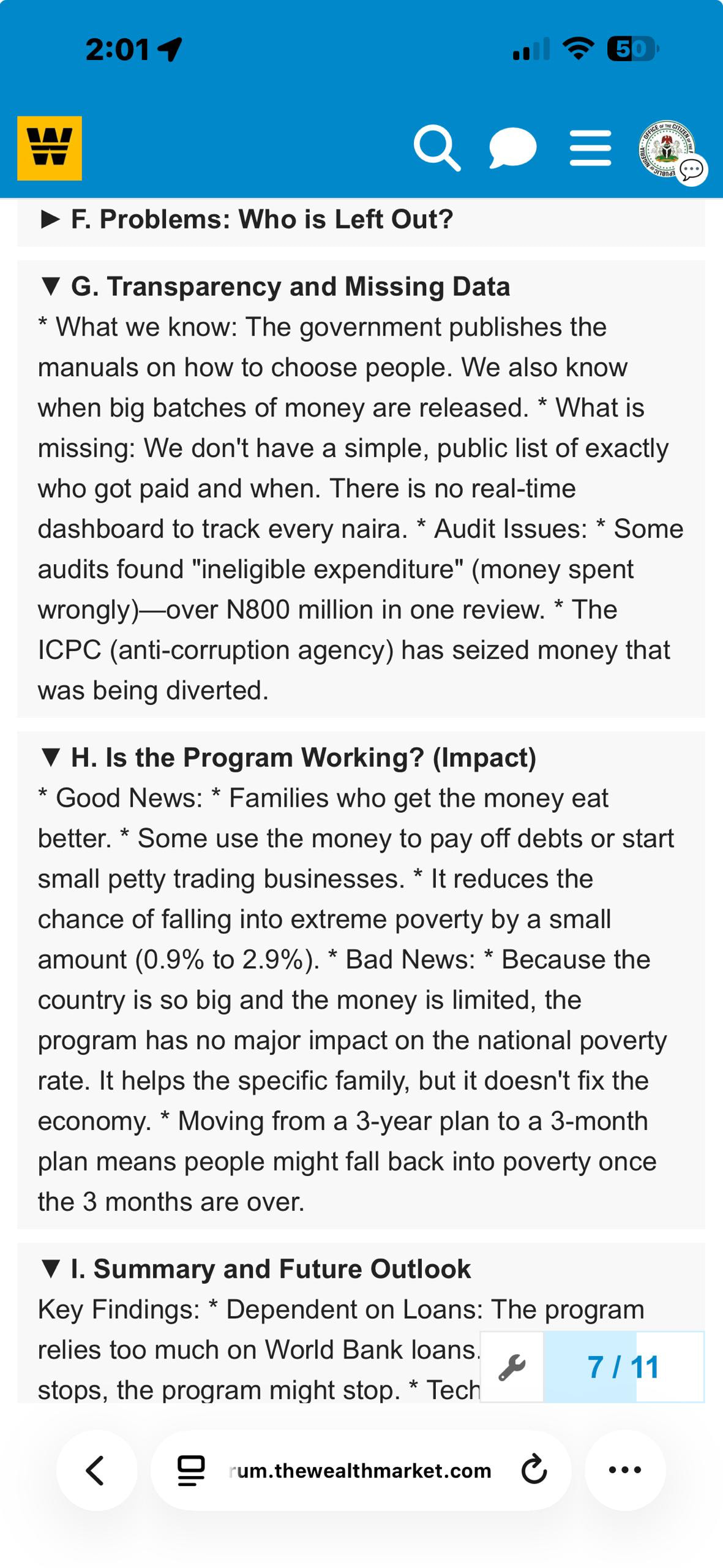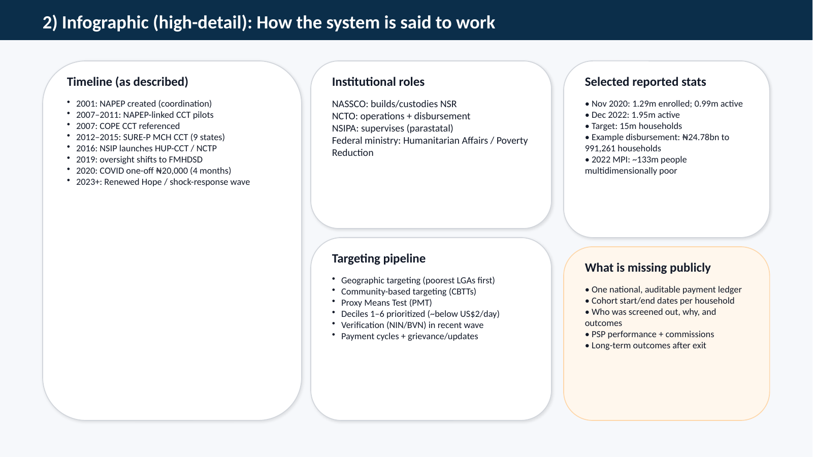 Taken together, the source write-ups portray a national cash transfer system that has built significant targeting and delivery machinery, but still struggles with (a) scale relative to Nigeria’s poverty burden, (b) bottlenecks from digital ID/biometric requirements, and (c) limited public transparency that prevents full independent auditing. Where figures conflict, the treatise keeps those conflicts separate and explains why they may differ.