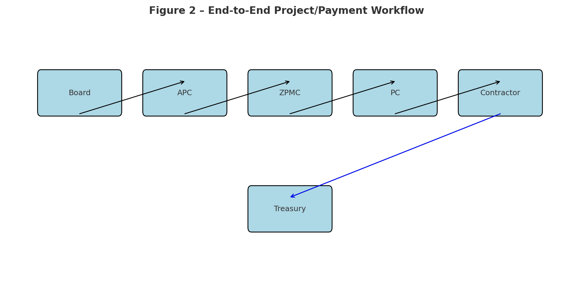 This shows the project lifecycle: from policy/funds released by the Board → APC design and budgeting → ZPMCs → Project Consultants → Contractors. Payments flow through Treasury after verification, with feedback loops for variations.